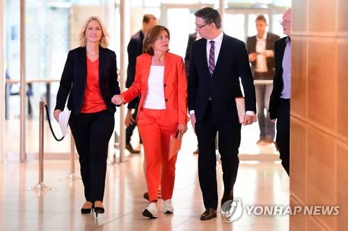 epa07622422 (L-R) Premier of Mecklenburg-Western Pomerania Manuela Schwesig, Premier of Rhineland-Palatinate Malu Dreyer and deputy Leader of the SPD Thorsten Schaefer-Guembel arrive for a joint press conference after an SPD board meeting at the SPD headquarters in Berlin, Germany, 03 June 2019. The threee will form the interim party leadership of the SPD after chairwoman and faction leader in the German parliament Andrea Nahles had announced her resignation from both positions a day earlier. EPA/CLEMENS BILAN