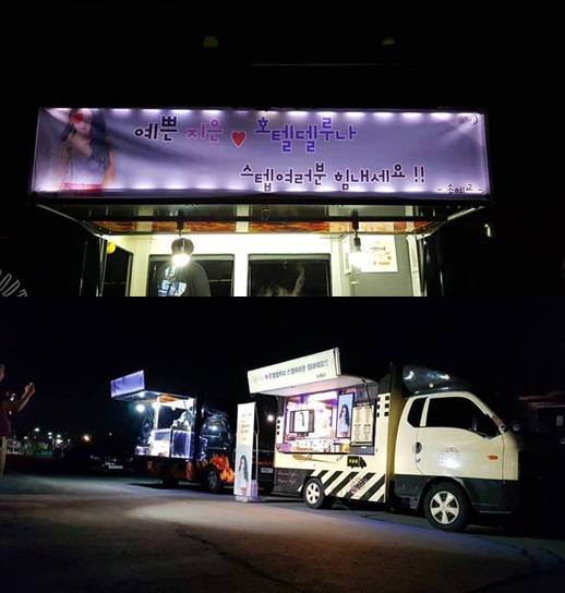 함께 공개된 사진에는 "예쁜 지은♥. '호텔 델루나' 스태프 여러분 힘내세요. 송혜교"라고 적힌 현수막과 함께 송혜교가 선물한 커피차 및 분식차의 모습이 담겨 있어 훈훈함을 자아냈다.