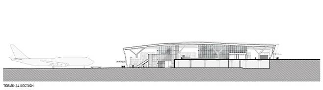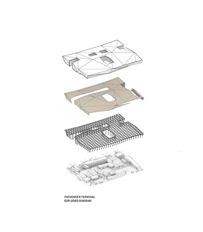 터미널의 구조적 연속성을 이어주는 북쪽과 남쪽의 항공지원시설은 36,210㎡ 규모이며, 흰색의 알루미늄 클레이딩 지붕과 스틸 멤브레인 구조가 흡사 우산처럼 부대시설을 안정적으로 떠받쳐주고 있다. 터미널과 비정형 구조의 유사성을 보이는 45m 높이의 항공기 관제탑은 컨트롤부스와 코디네이션센터로 구성한다. 여객터미널은 단순한 정방형의 볼륨에서 주변 환경에 대응하여 경사지고 절개되며 뚫어지는 매스의 변형을 취한다. 터미널 외관의 재료 역시 철골 구조에 삼각형 알루미늄 패널과 글래스 클레이딩, 우드 패널을 활용해 다이내믹한 벽과 지붕의 표면 질감을 형성한다.