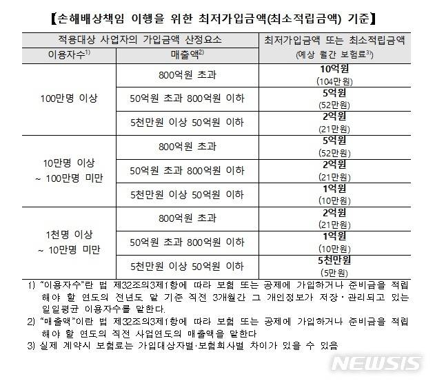 보험 또는 공제에 가입하거나 준비금을 적립할 경우 최저가입금액은 사업자별 이용자수와 매출액에 따라 차등해 최저 5000만원에서 최고 10억원으로 설정했다.