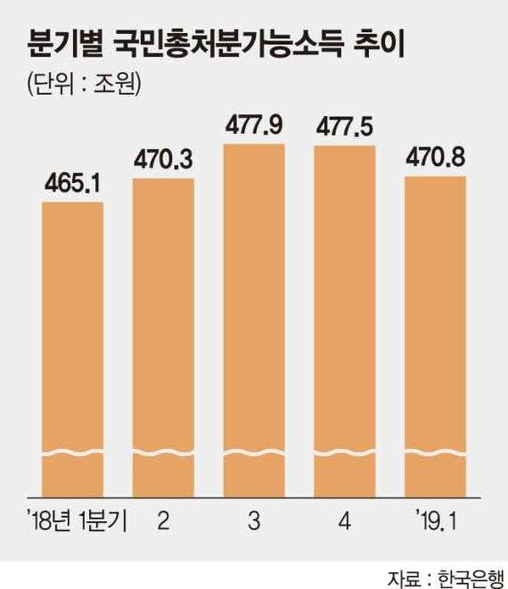 6일 한은에 따르면 지난 1·4분기 국민총처분가능소득(GNDI)은 470조8000억원으로 전분기 대비 1.4% 줄었다.