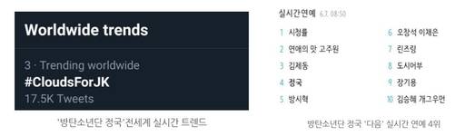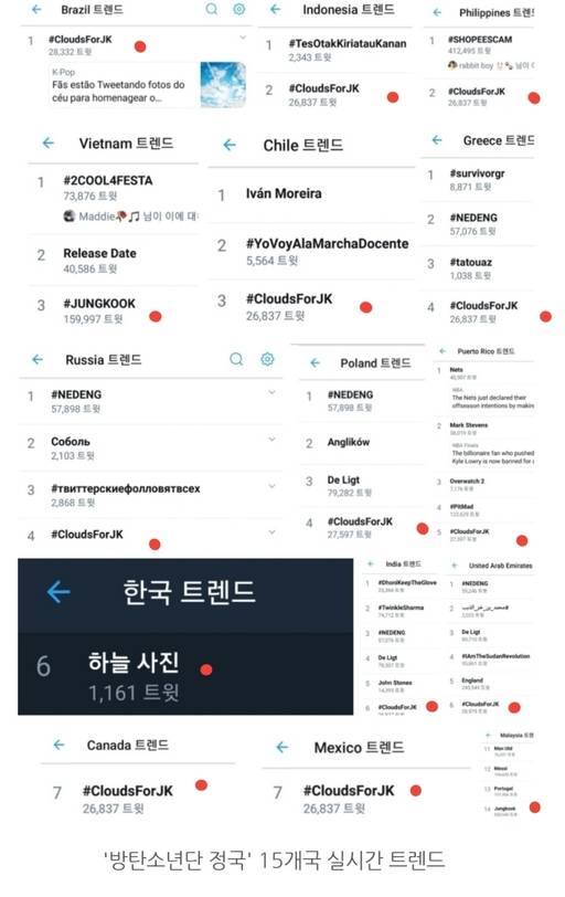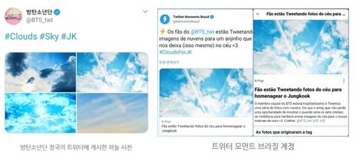 이에 '트위터 모먼츠 브라질계정'이 정국의 사진을 게시하며 큰 이슈를 자아냈고 즉시 '#CloudsForJK', 'JUNGKOOK', 'Jungkook', '하늘사진'으로 브라질 1위, 인도네시아 2위, 필리핀 2위, 베트남 3위, 칠레 3위 등 15개국 실시간 트렌드, 전세계 실시간 트렌드 3위에까지 오르며 전세계를 장악했다.