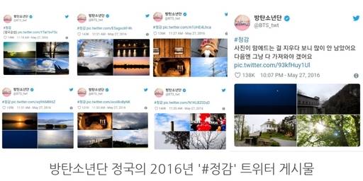 정국은 항상 카메라를 들고 다니며 과거 2016년 '#정감'이란 글귀로 그의 감성을 느낄 수 있는 사진들을 공식 트위터에 게시하며 일찌감치 그 실력을 인정받았다.