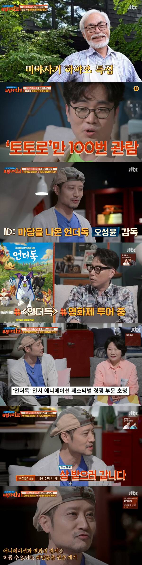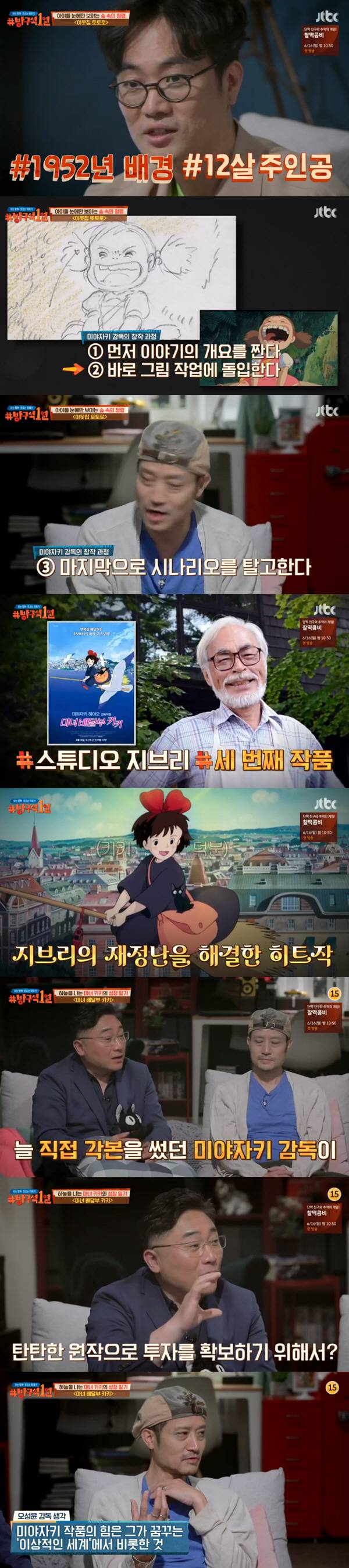7일 방송된 JTBC '방구석1열'은 일본 애니메이션의 거장 미야자키 하야오의 '이웃집 토토로'와 '마녀 배달부 키키'를 다뤘다. 이날 게스트로는 오성윤 감독과 동화작가 황선미 교수, 세종대학교 만화 애니메이션텍전공 한창완 교수가 함께했다.