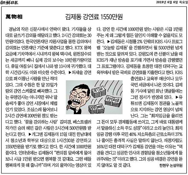 | ▲ 6일자 <조선일보>에 실린 '[만물상] 김제동 강연료 1550만 원' |