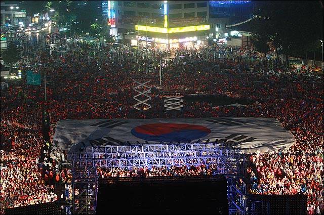 | ▲ 2010 남아공 월드컵 한국과 우루과이와의 16강 경기가 열린 2010년 6월 26일 밤 서울광장에 모인 붉은악마들이 경기가 시작되자 대형 태극기를 펼쳐보이고 있다. |