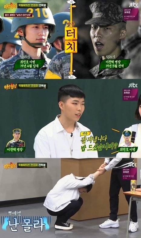 끝으로 후임인 민호에게 전하고 싶은 말을 묻자 이찬혁은 "지금 걸레 빨고 있을 텐데, 그래 뺑이(?) 쳐라"라고 말해 모두를 폭소케 했다. 이어 이찬혁은 "원래 그 말이 해병대에선 인사말이다"라며 어색함에 자리에 주저앉았다.