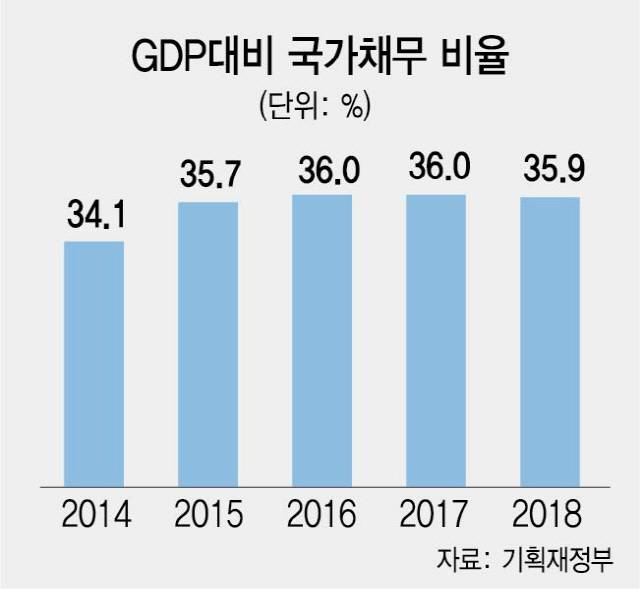 한편 당청은 한국은행이 국민계정 기준연도를 2010년에서 2015년으로 개편하면서 명목 GDP가 111조원 늘어난 만큼 국가채무비율이 떨어진 점을 강조하고 있다. 2018년 기준 국가채무비율은 기존 38.2%에서 35.9%로 낮아지게 된 만큼 재정확대를 강행한다는 입장이다. /세종=황정원기자 garden@sedaily.com
