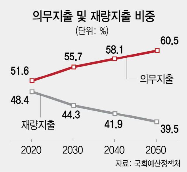 실제 올해 만 6세 미만에게 지급하는 아동수당에 투입되는 예산은 3조원, 기초연금에는 15조원이 책정됐다. 또 저소득층 근로자에게 현금수당을 지급하는 국민취업지원제도가 시행되면 2022년 1조원 이상의 돈이 들어가고, 고교 무상교육 전면 도입에 따라 연간 2조원의 국가예산이 쓰인다. 이미 문재인 정부 들어 법적으로 지급 의무가 명시된 의무지출 비중이 50%를 넘어선 상황에서 복지확대 정책의 영향으로 급격히 증가할 전망이다. 국회예산정책처는 의무지출 증가율이 2022년 전체 지출의 51.6%에서 2030년 55.7%, 2050년 60.5%로 확대될 것으로 내다봤다. /세종=황정원기자 garden@sedaily.com