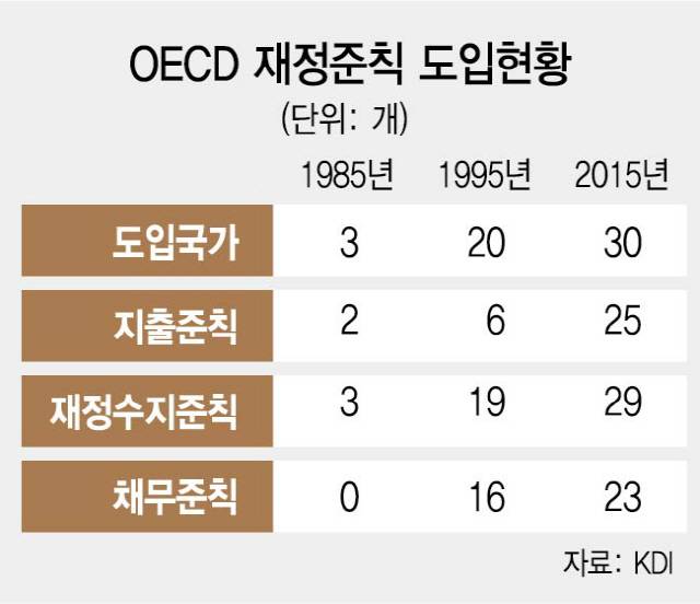 이로 인해 KDI는 “암묵적 형태의 준칙을 활용해 채무 증가 속도를 억제할 필요가 있다”면서 “일정 수준 이하로 동결하는 게 단기적으로 적절한 대안이 될 수 있다”고 제시했다. 재정수입에 대한 전망에 근거해 현실적으로 유지 가능한 재정수지 적자 규모를 도출하고 이를 준칙화함으로써 재정지출 규모를 통제해야 한다는 것이다. 재정준칙 적용범위는 중앙정부, 지방정부, 연금/건보를 포괄해야 한다고 권고했다. 기재부도 논란이 큰 GDP 대비 국가채무비율보다는 관리재정수지적자 관리를 위한 내규 마련의 필요성을 인지하고 있어 이달 중 본격 공론화를 할 방침이다. 한 정부 관계자는 “방향성을 정하고 사회적 합의가 있어야 한다”면서 “재정준칙에 관한 진전된 논의의 장이 열릴 것”이라고 말했다.