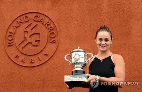 epa07636539 Ashleigh Barty of Australia poses with the trophy after winning the women?s final match against Marketa Vondrousova of the Czech Republic during the French Open tennis tournament at Roland Garros in Paris, France, 09 June 2019. EPA/CAROLINE BLUMBERG