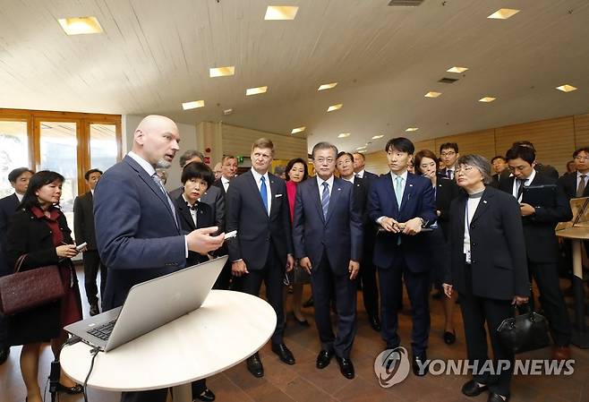 (헬싱키=연합뉴스) 배재만 기자 = 핀란드를 국빈방문 중인 문재인 대통령이 10일 오후 (현지시간) 유기적인 산학연 생태계를 바탕으로 ‘유럽의 실리콘밸리’로 성장한 핀란드의 오타니에미 혁신 단지 내 인재양성과 기술개발의 중심축인 알토대를 방문, '한-EU 5G 공동연구 부스'를 둘러보고 있다. 2019.6.10