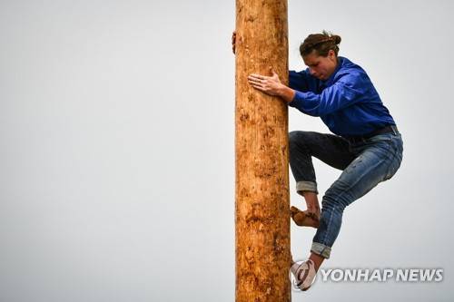 epa07638922 A competitor climbs the maypole in Rottenstuben, Germany, 10 June 2019. Climbing the 25-meter-high maypole is a 47-year-tradition and is said to have been started by young men trying to impress women. The competition is held in two disciplines: speed and acrobatics. EPA/PHILIPP GUELLAND ATTENTION: This Image is part of a PHOTO SET