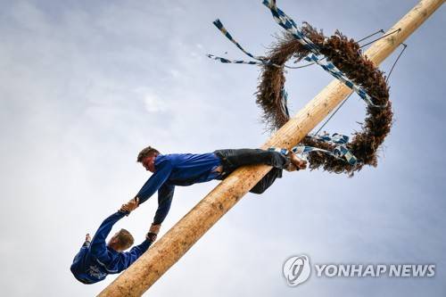 epa07638929 Competitors perform acrobatics on the maypole in Rottenstuben, Germany, 10 June 2019. Climbing the 25-meter-high maypole is a 47-year-tradition and is said to have been started by young men trying to impress women. The competition is held in two disciplines: speed and acrobatics. EPA/PHILIPP GUELLAND ATTENTION: This Image is part of a PHOTO SET
