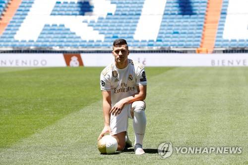epa07643404 Real Madrid's new soccer player Luka Jovic poses during his presentation at Santiago Bernabeu stadium in Madrid, Spain, 12 June 2019. Jovic has signed a five-seasons-contract with Real Madrid after Spanish LaLiga's club Real Madrid reached an agreement with Eintracht Frankfurt for his transfer in the region of 60 million euro plus five on variables. EPA/Juan Carlos Hidalgo