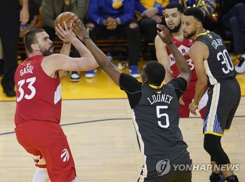 epa07646979 Toronto Raptors center Marc Gasol of Spain (L) takes a shot against Golden State Warriors center Kevon Looney (C) during the first half of the NBA Finals basketball game six between the Toronto Raptors and the Golden State Warriors at Oracle Arena, in Oakland, California, 13 June 2019. EPA/JOHN G MABANGLO SHUTTERSTOCK OUT