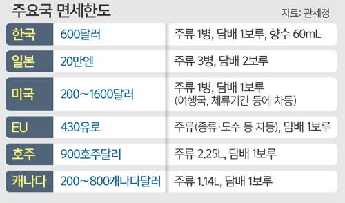 기재부 관계자는 “1000달러 통합 방안은 여러 방안 중 하나이긴 하지만 술과 담배 등을 통합하는 나라는 많이 없는 것이 사실”이라며 “국민 법 감정과 해외 사례 등 다양하게 검토할 예정이다. 현행 유지도 방안 중의 하나”라고 설명했다.