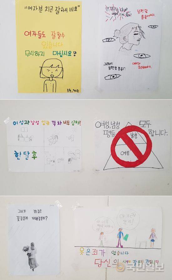 “성 고정관념이 있는 노래가사를 바꿔보는 활동을 하거나, 미디어 속에서 성역할을 어떻게 표현하고 있는지, 이런 편견을 어떻게 하면 깰 수 있는지 토론해요. 인권포스터와 피켓을 만들어 캠페인 활동도 했어요. 고전문학을 읽으며 그 안에 들어있는 성차별에는 어떤 것이 있는지 찾아보기도 했죠.”