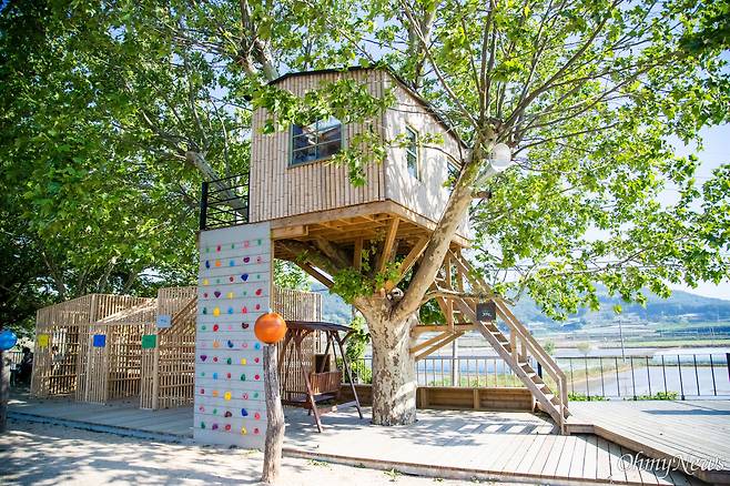 | ▲ 책마을 해리의 입구 옆 플라타너스 나무 위에 대나무로 만든 오두막이 있다. 누구나 책을 읽을 수 있도록 만든 또 하나의 작은 도서관이다. |