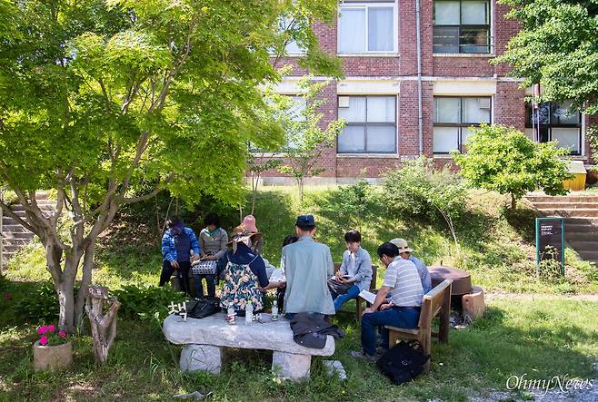 | ▲ 시니어 독서 동호회에서 책마을 해리를 알고 독서모임을 하기 위해 찾아와 나무 그늘 아래서 함께 독서토론을 하고 있다. |