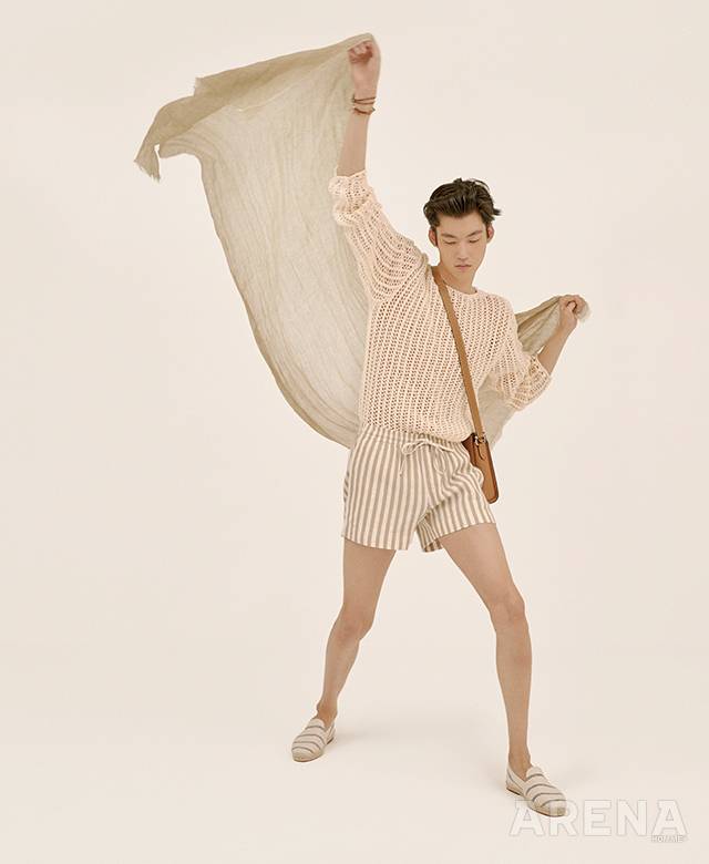 오픈 니트 스웨터 50만원대 자크 뮈스 by 미스터포터, 줄무늬 리넨 쇼츠 30만원대 콤마스 by 매치스패션닷컴, 에스파드리유 70만원대 로로 피아나, 가죽 메신저백 1백25만원 살바토레 페라가모, 리넨 머플러 68만원 체사레 아톨리니 by 지.스트리트 494 옴므, 브레이슬릿 12만1천원 불레또 제품.