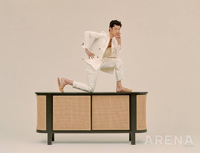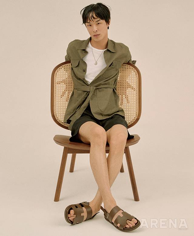 리넨 사파리 셔츠 36만원 오리앙 by 지.스트리트 494 옴므, 리넨 쇼츠 가격미정 에초, 가죽 샌들 가격미정 에르메스, 네크리스 가격미정 루이 비통, 메시 슬리브리스 톱 에디터 소장품, 케인 라운지 체어 1백42만원 언와인드 제품.