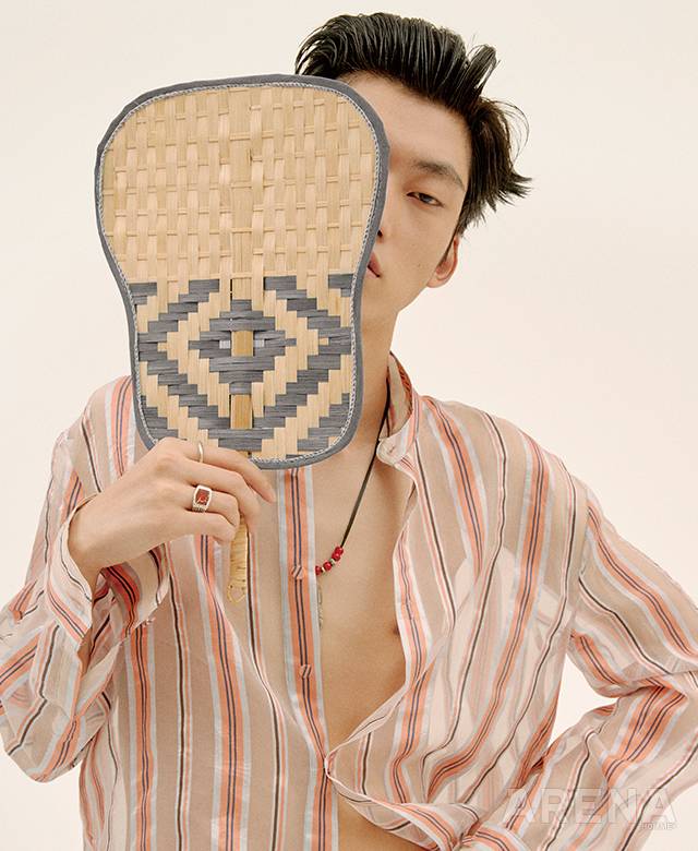 줄무늬 시스루 셔츠 69만8천원·쇼츠 49만8천원 모두 김서룡, 깃털 펜던트 네크리스 22만9천원·실버 링 16만9천원·스톤 링 18만1천원 모두 불레또, 부채 에디터 소장품.
