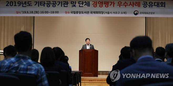 (서울=연합뉴스) 박양우 문화체육관광부 장관이 18일 서울 국립중앙도서관에서 열린 '2019년도 기타공공기관 및 단체 경영평가 우수사례 공유대회'에서 인사말을 하고 있다. 2019.6.18