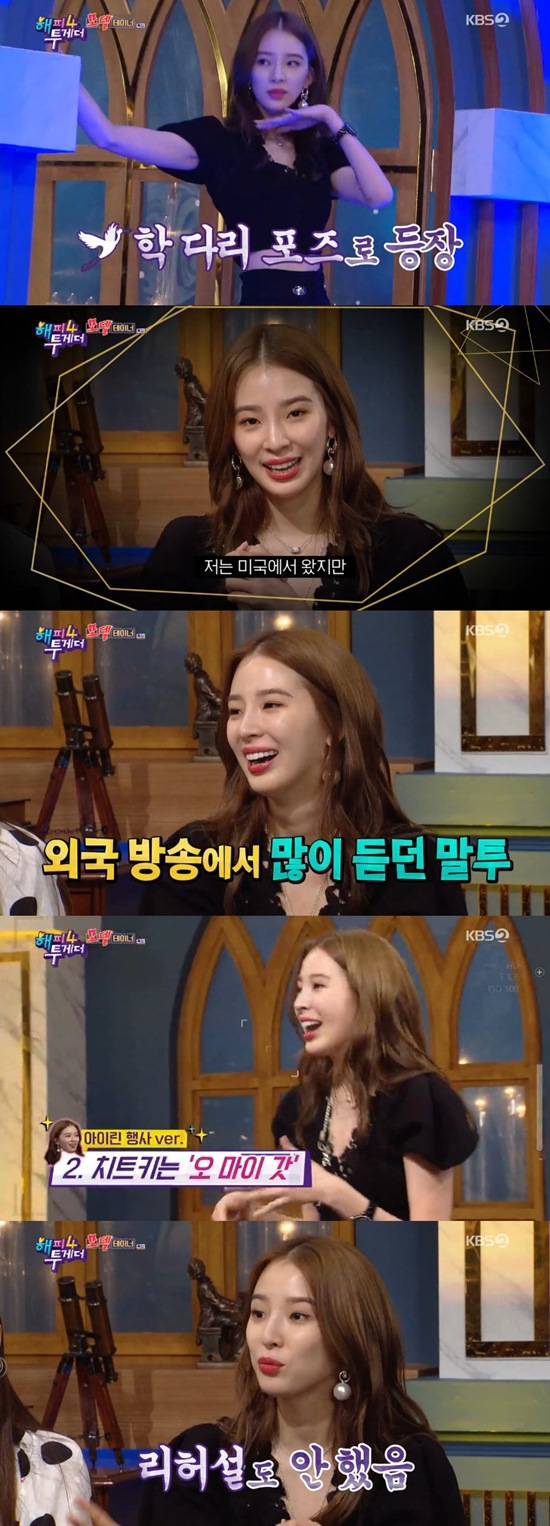 아이린은 글로벌 인플루언서 면모를 뽐냈다. 아이린은 "저는 미국에서 왔지만 현재 한국에서 활동하고 있다. 모델이자 인플루언서다"라고 소개했다. 아이린은 "행사를 너무 많이 다니다 보니까 긍정적인 행사 말투가 생겼다"며 최대한 하이 텐션인 미국식 인사를 보여줘 웃음을 안겼다.
