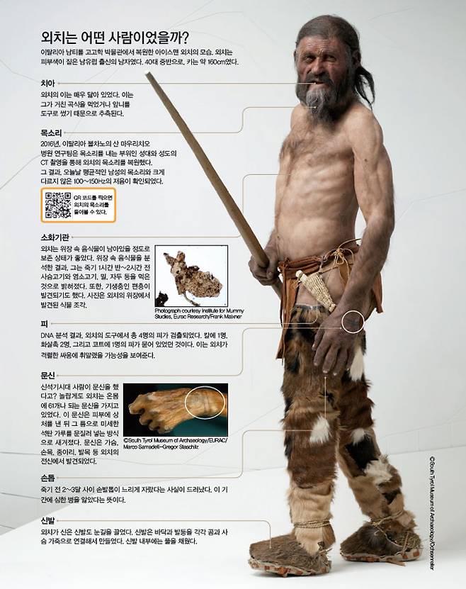 슬프지만, 이런 사고 때문에 외치의 몸은 빙하 속에서 온전히 보존되었습니다. 그리고 반만년의 세월이 지나 다시 모습을 드러낸 외치는 현대인에게 당시의 모습에 대해 그 누구보다 자세한 이야기를 들려주고 있습니다.