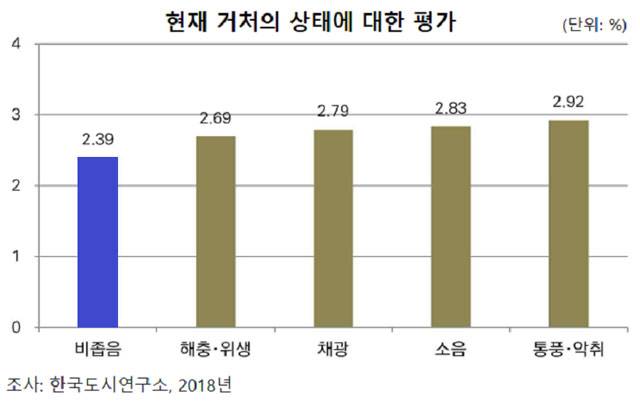 한국도시연구소가 고시원이나 숙박업소의 쪽방 등 비주택에서 거주하는 203가구를 대상으로 현재 살고 있는 곳의 물리적인 상태에 대한 주관적 인식을 5점 만점으로 면접조사했다. 그랬더니 살고 있는 곳이 비좁다는 게 2.39점으로 가장 안 좋은 점수를 받았고, 이어서 해충이나 위생상태가 2.69점으로 좋지 않은 점수를 받았다. 현재 사는 곳이 조금만 더 넓었으면, 그리고 조금만 위생상태가 좋았으면 하는 바람이 가장 컸던 것이다. 아래 그래프를 보면 그래프 숫자가 적을수록 거주 환경이 안좋다는 뜻이다.