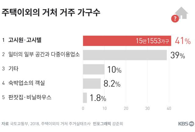 국토부의 주거실태조사를 보면 주택 이외의 장소에서 사는 가구 가운데‘고시원·고시텔’에 거주하는 가구는 15만 1,553가구(41.0%)로 가장 거주 비율이 높았다. 이어서 ‘일터의 일부 공간과 찜질방 같은 다중이용업소’에 14만 4,130가구(39.0%), 숙박업소의 객실에 30,411가구(8.2%), 판잣집·비닐하우스에 6,601가구(1.8%)가 살고 있는 것으로 나타났다.