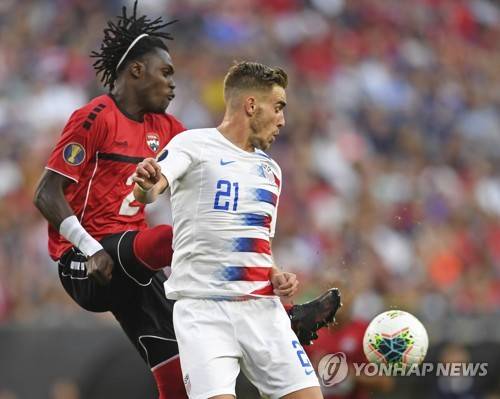 U.S. forward Tyler Boyd plays the ball against Trinidad and Tobago defender Aubrey David during the first half of a CONCACAF Gold Cup soccer match Saturday, June 22, 2019, in Cleveland. (AP Photo/David Dermer)