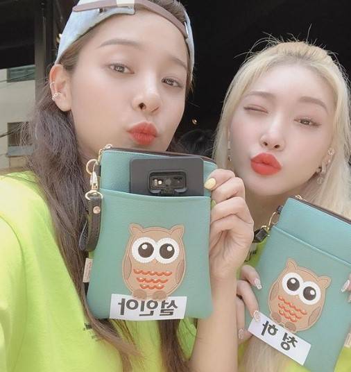 공개된 사진 속에 설인아와 청하가 입술을 내민 채 카메라를 응시하고 있다. SBS `런닝맨` 촬영 중 함께 시간을 보내고 있는 두 사람은 각자의 이름표를 들고 있다.
