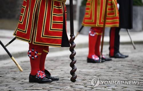 epa07670448 Crew members of the ship HMS Enterprise and Yeoman Warders take part in the Constable's Dues ceremony at the Tower of London, in London, Britain, 24 June 2019. The ceremony dates back to the 14th Century when the King of England taxed passing ships entering London. A barrel of wine or brandy is offered to the Tower's Constable. EPA/NEIL HALL