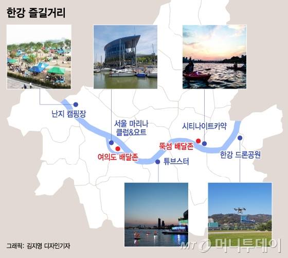 주말이면 배달 음식을 주문한 사람들로 붐비다 보니 아예 배달존까지 생겼다. 한강에는 총 5곳의 배달존이 있는데 각각 뚝섬공원에 2곳, 여의도공원에 3곳이 마련돼 있다. 주문하고 해당 장소에서 기다리면 주문한 음식을 손쉽게 받아갈 수 있다.