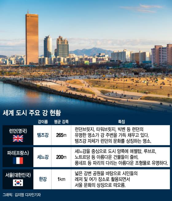 세계 주요 도시들은 대부분 강을 끼고 있다. 영국과 프랑스를 비롯한 선진국들은 치수(治水)라는 하천 본래의 기능을 유지하면서 지역경관, 역사, 문화 등을 활용해 템즈강과 세느강을 자연생태 보존과 관광·편의시설을 아우르는 매력적인 관광 명소로 조성했다. 특히 도시에 살고 있는 사람들에게 자연과 가장 쉽게 접하고 즐길 수 있는 곳이 강이라는 점에서 도심 강의 가치가 크다.