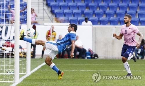epa07671720 Manuel Rosas (L) of Nicaragua saves the ball from going in the goal as Nahki Wells (R) of Bermuda looks on during the first half of the CONCACAF Gold Cup group stage soccer match between Bermuda and Nicaragua at Red Bull Stadium in Harrison, New Jersey, USA, 24 June 2019. EPA/JUSTIN LANE