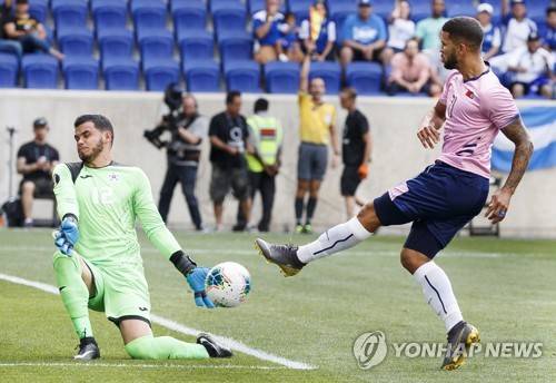 epa07671736 Nicaragua's goalkeeper Henry Maradiaga (L) makes a save on a shot by Nahki Wells (R) of Bermuda during the first half of the CONCACAF Gold Cup group stage soccer match between Bermuda and Nicaragua at Red Bull Stadium in Harrison, New Jersey, USA, 24 June 2019. EPA/JUSTIN LANE