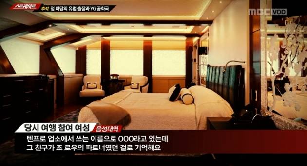 '스트레이트' 제작진은 목격자 A씨의 증언을 인용해 "조로우 일행과 정마담, 양현석이 강남 정마담의 고급 유흥업소에서 만남을 가진지 한 달 뒤인 2014년 10월, 조로우의 초대로 정마담이 인솔한 10여명의 여성들이 프랑스로 건너가 초호화 여행을 즐겼다"고 주장했다.