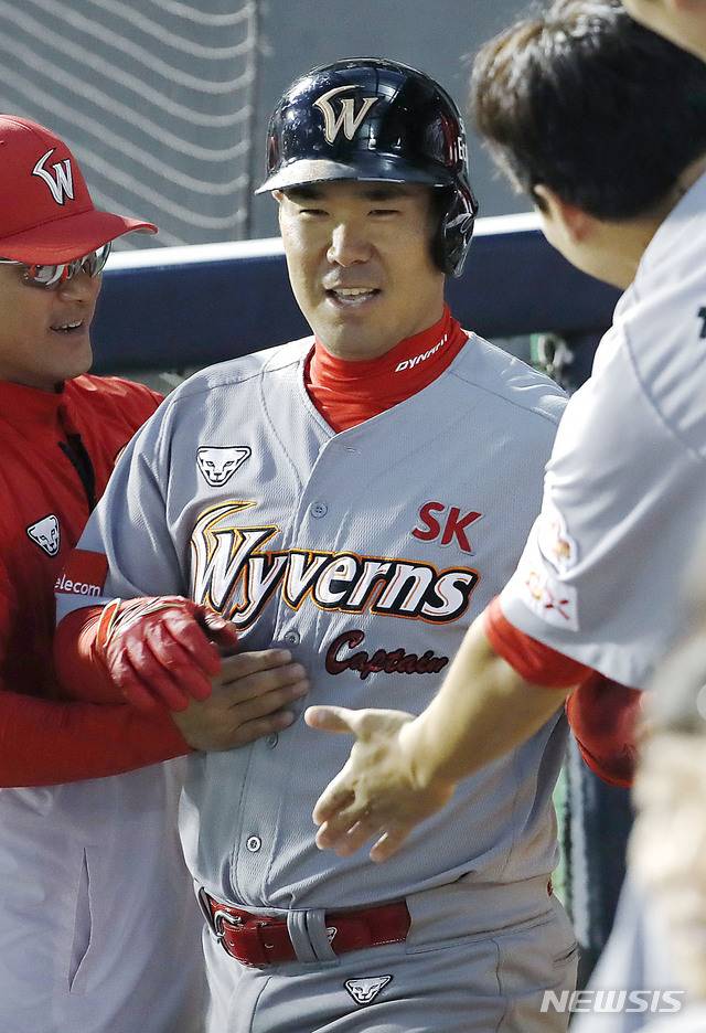 【서울=뉴시스】최동준 기자 = 25일 서울 잠실야구장에서 열린 2019 KBO 리그 SK 와이번스 대 LG 트윈스의 경기, 5회초 1사 1, 3루 상황 SK 이재원이 1타점 내야땅볼을 친 뒤 동료들과 하이파이브 하고 있다. 2019.06.25.