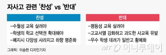 반면 폐지에 찬성 측은 자사고가 고교 서열화를 부추기고 첫 도입 취지와 달리 입시학원으로 전락했다는 부정적 측면을 강조한다.