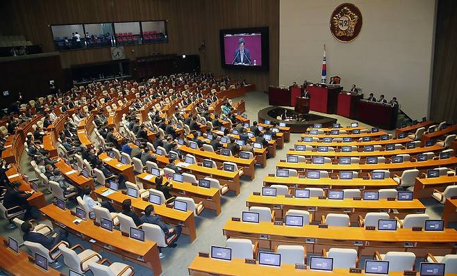 ▲ 이낙연 국무총리가 24일 오후 서울 여의도 국회에서 열린 본회의에서 자유한국당 의원들의 불참한 가운데 2019년도 추가경정예산안에 대한 정부의 시정연설을 하고 있다. 이날 여야3당 원내대표가 국회 정상화에 합의했지만, 자유한국당은 이후 열린 의원총회에서 일부 의원들의 반대 의견으로 합의안 추인이 불발돼 본회의에 불참했다.