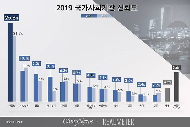 이어 시민단체(10.1%)가 두 번째였다. 그 뒤를 언론(9.0%), 종교단체(8.1%), 대기업(6.3%), 법원(5.9%), 중앙정부 부처(4.8%), 노동조합(4.1%), 군대(3.9%) 순으로 이어졌다. 가장 낮은 신뢰도를 기록한 3개 기관은 경찰(2.2%), 국회(2.4%), 검찰(3.5%)이었다. 이 기관들은 지난해 조사에서도 최하위권이었다.