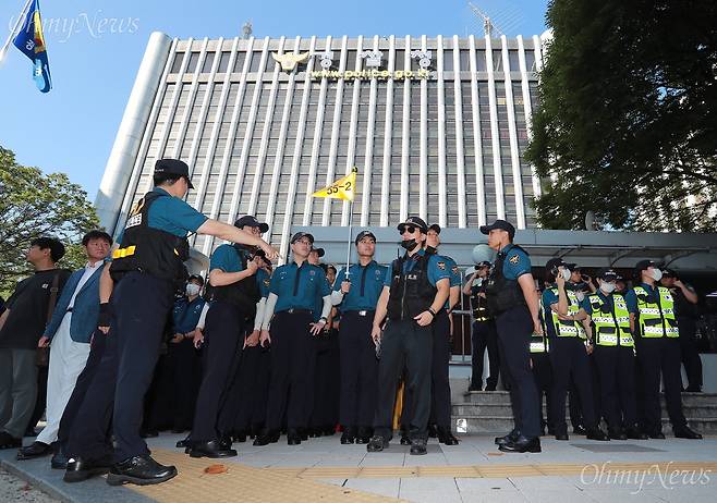 ▲ 2018년 9월 5일 오전, 조현오 전 경찰청장이 댓글공작 관련 조사를 받기 위해 서울 서대문구 경찰청에 소환되던 날 경찰 수백 명이 삼엄한 경비를 서고 있는 모습.