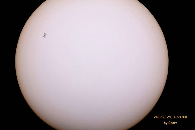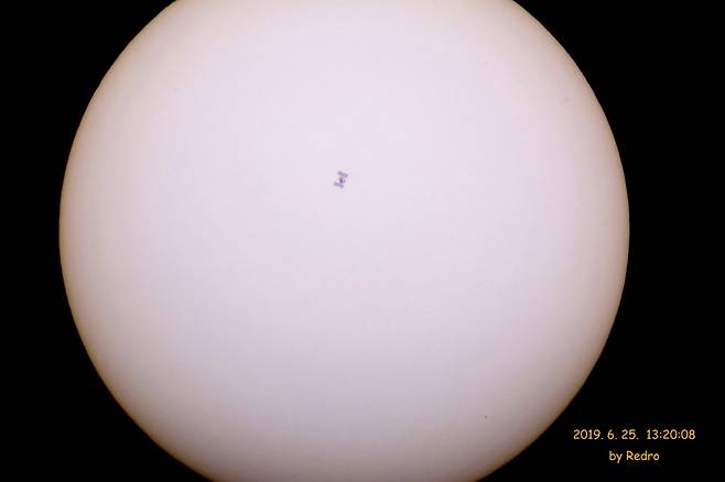 지난 25일 아마추어 천문가 김창섭씨는 이날 오후 1시 20분 8초에 ISS가 0.53초간 태양을 지나는 순간을 촬영한 사진과 영상을 본지에 보내왔다.