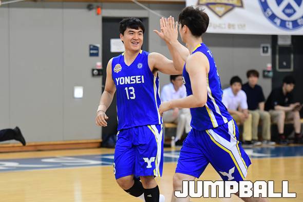 [점프볼=서울/박상혁 기자] 27일 연세대 신촌캠퍼스에서 열린 연세대와 관서연맹선발팀간의 연습경기, 연세대 한승희와 김경원이 경기 도중 하이파이브를 하고 있다. 2019-06-27 박상혁(sea80288@naver.com)