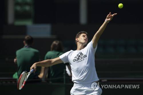 epa07677326 Dominic Thiem of Austria serves a ball during a training session at the All England Lawn Tennis Championships in Wimbledon, London, on Thursday, June 27, 2019. EPA/PETER KLAUNZER EDITORIAL USE ONLY; NO SALES, NO ARCHIVES