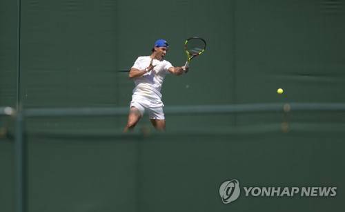 epa07677325 Rafael Nadal of Spain hits a ball during a training session at the All England Lawn Tennis Championships in Wimbledon, London, on Thursday, June 27, 2019. EPA/PETER KLAUNZER EDITORIAL USE ONLY; NO SALES, NO ARCHIVES
