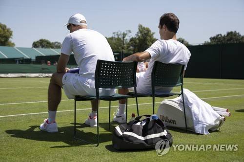 epa07677323 Roger Federer of Switzerland, right, sits next to his coach Ivan Ljubicic during a training session at the All England Lawn Tennis Championships in Wimbledon, London, on Thursday, June 27, 2019. EPA/PETER KLAUNZER EDITORIAL USE ONLY; NO SALES, NO ARCHIVES